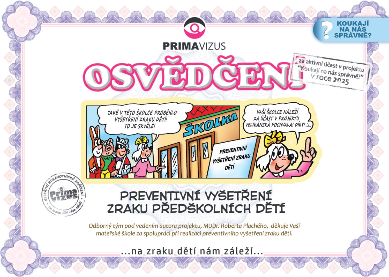 v naší školce Vám zprostředkováváme odbornou konzultaci s logopedkou, Mgr. Zuzanou Bůškovou. Dále vyšetření zraku firmou PRIMAVIZUS i test školní zralosti MaTeRs, kterého se mohou zúčastnit naši předškoláci pod vedením paní psycholožky, Mgr. Moniky Válkové.